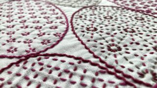 刺し子 花ふきん 寄せ模様 円紋 丸みのあるオーバル型の中を花亀甲、麻の葉、十字花刺し、クロス方眼、網代、篭目、米刺しの7種類の刺し子の伝統柄で埋めていきます。 寄せ模様 円紋の全体です。 約8×13㎝のオーバル型が並んでいます。 2026.02.01 刺し子