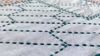 刺し子 花ふきん 合わせ模様 千代紙 青海波、麻の葉、花菱、毘沙門亀甲、矢羽根、分銅つなぎで、大小様々な千代紙の中を刺し埋めていきます。 外枠は合わせ模様 千代紙を刺し終えてから取り掛かることにした為、ダルマシツケ糸1本どりで躾をかけておきました。 2025.10.01 刺し子