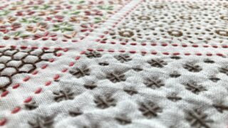 刺し子 花ふきん 寄せ模様 ダイヤならべ 規則的に並んだダイヤ形の中を花あそび、お花畑、米刺し、七宝つなぎ、十字花刺し、つづき山形、麻の葉、輪がさねで刺し埋めていきます。 最初に花ふきん全体にあるダイヤ形のラインを並縫い。 使用した刺し子糸はオリムパスさんのThread126です。 2026.01.01 刺し子